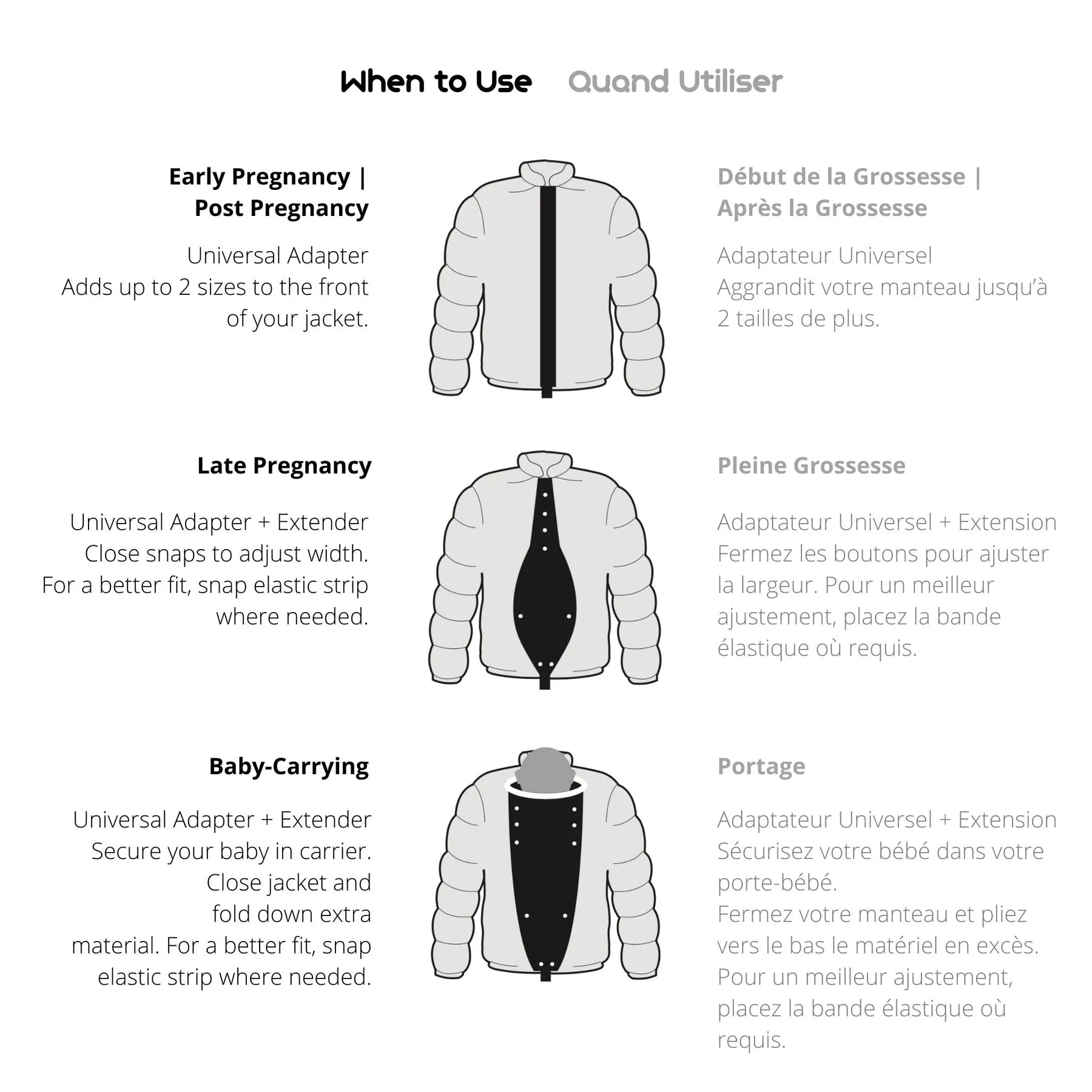 Plastic snaps allow the width of the extender to be adjusted. The included elastic strip can be snapped anywhere on the extender for an even better fit. There is a snap on fleece panel for an extra layer of warmth (included) and can be removed for warmer days. The insert is 27" long, one size fits MOST. Proudly made in Canada. This is a great alternative to buying a maternity/babywearing coat or wearing your husbands!