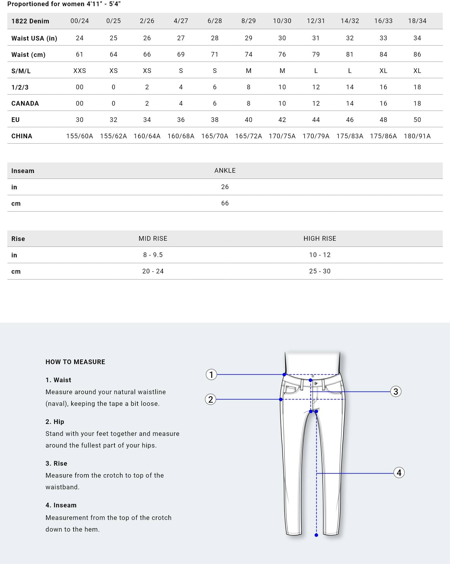 Size 24- 00, Size 25-0, Size 26-2, Size 27-4, Size 28-6, Size 29-8, Size 30-10, Size 31-12, Size 32-14