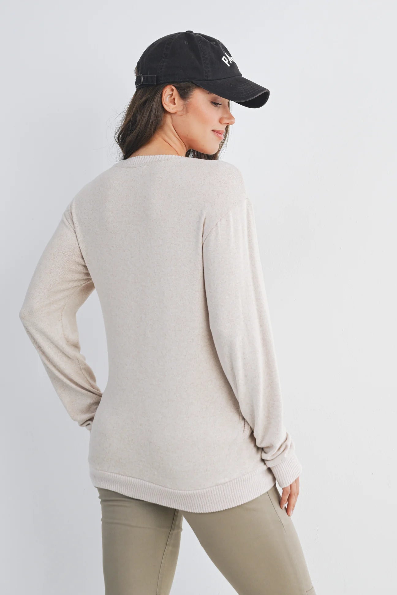 You think cozy, you think the Amelia! This super soft sweatshirt will rock you through your pregnancy & beyond. Made in a cozy textured blend it will grow with you & be a go to in those postpartum days as well. For those who breastfeed the clever design allows for a discreet side entrance for feeding on the go! Pair it with your fave leggings or jeans!