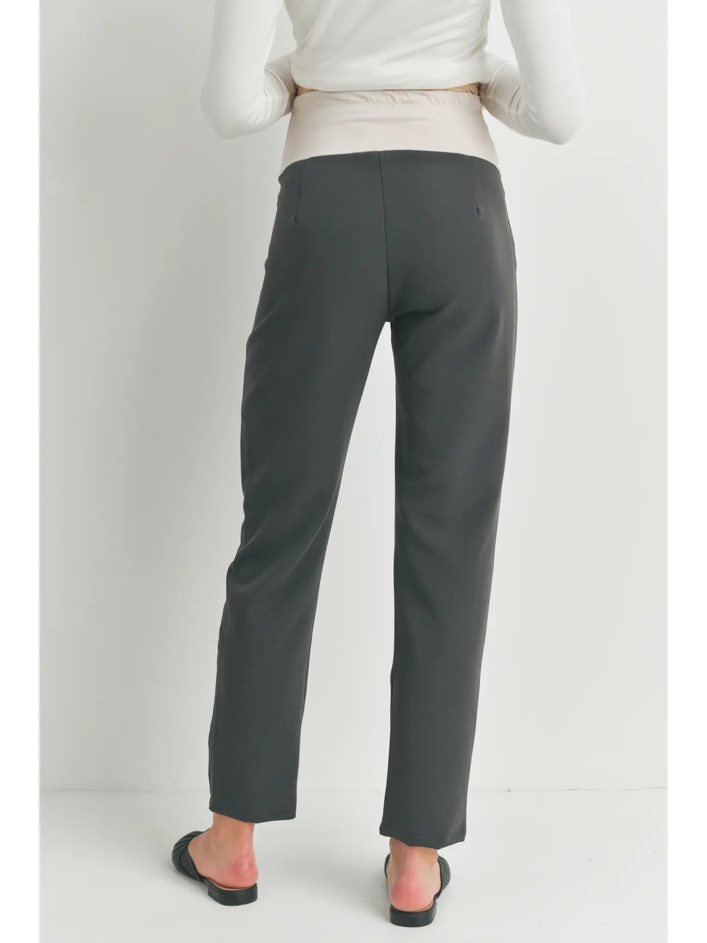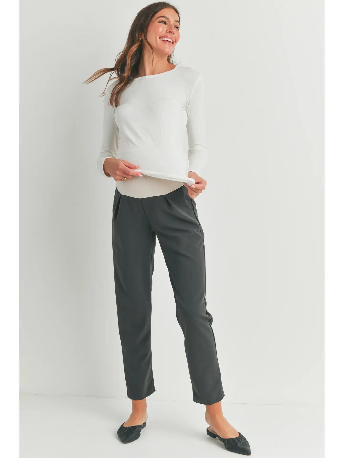 These full panel maternity pants can be dressed up for the office or a night out, OR worn with sneakers & a leather jacket for a casual chic look! Featuring front pleats, pockets and an ankle length for the perfect style!! Inseam: 28''