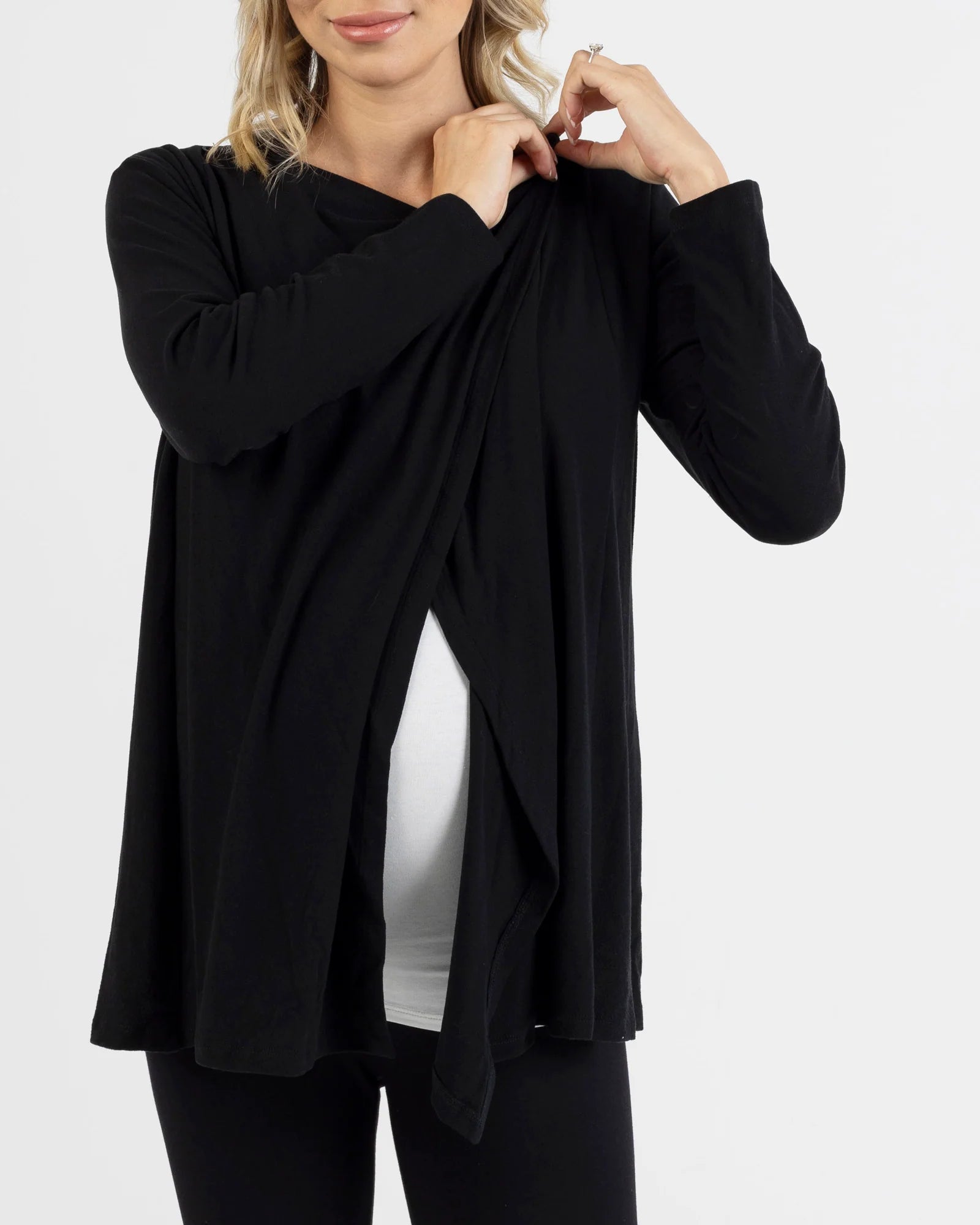 A cardigan designed for various stages of motherhood. The shoulder features buttons for easy breastfeeding access, making it both practical and stylish. The open-front overlay style allows for easy wear and removal, providing pregnant & new mothers with maximum convenience and comfort.
