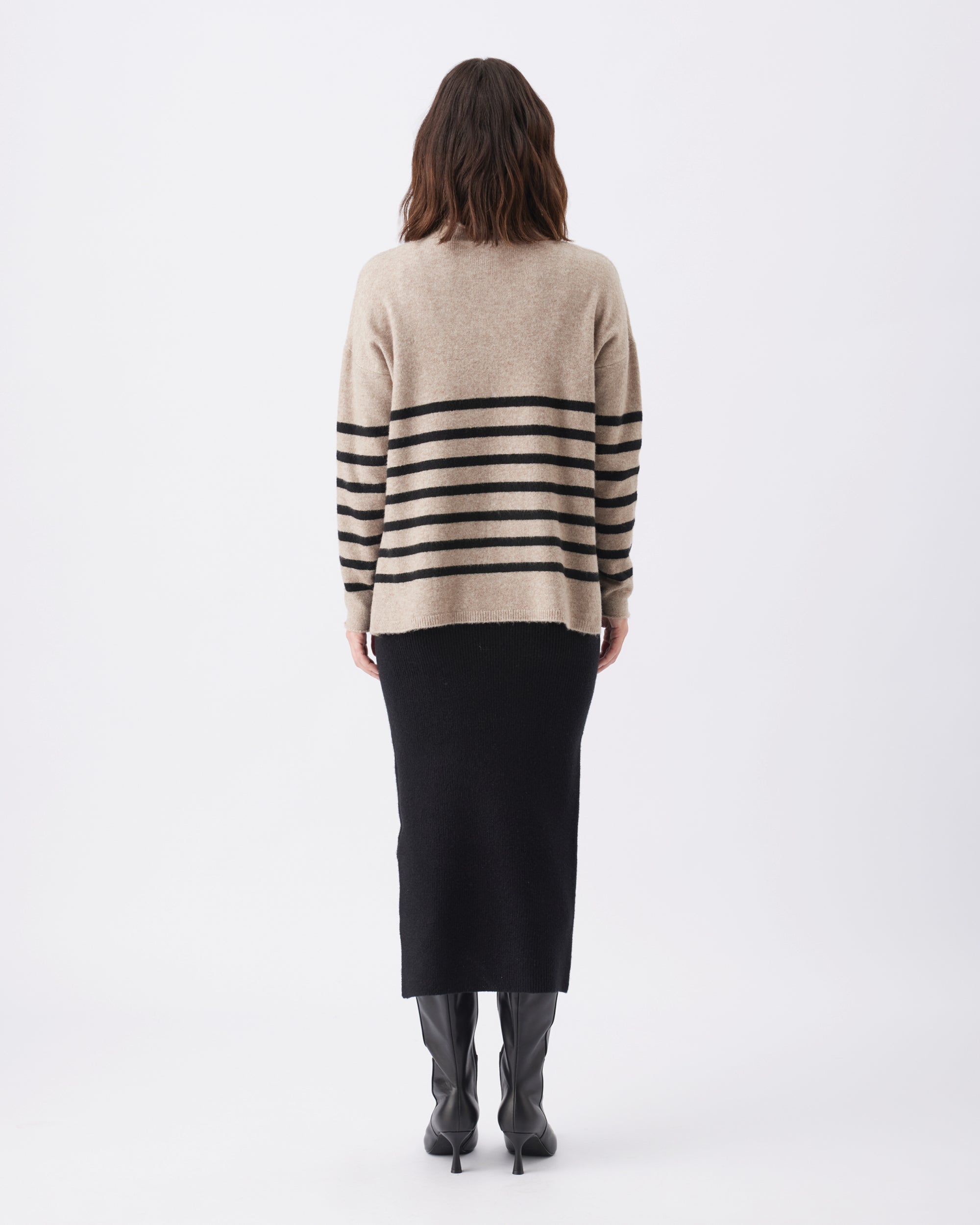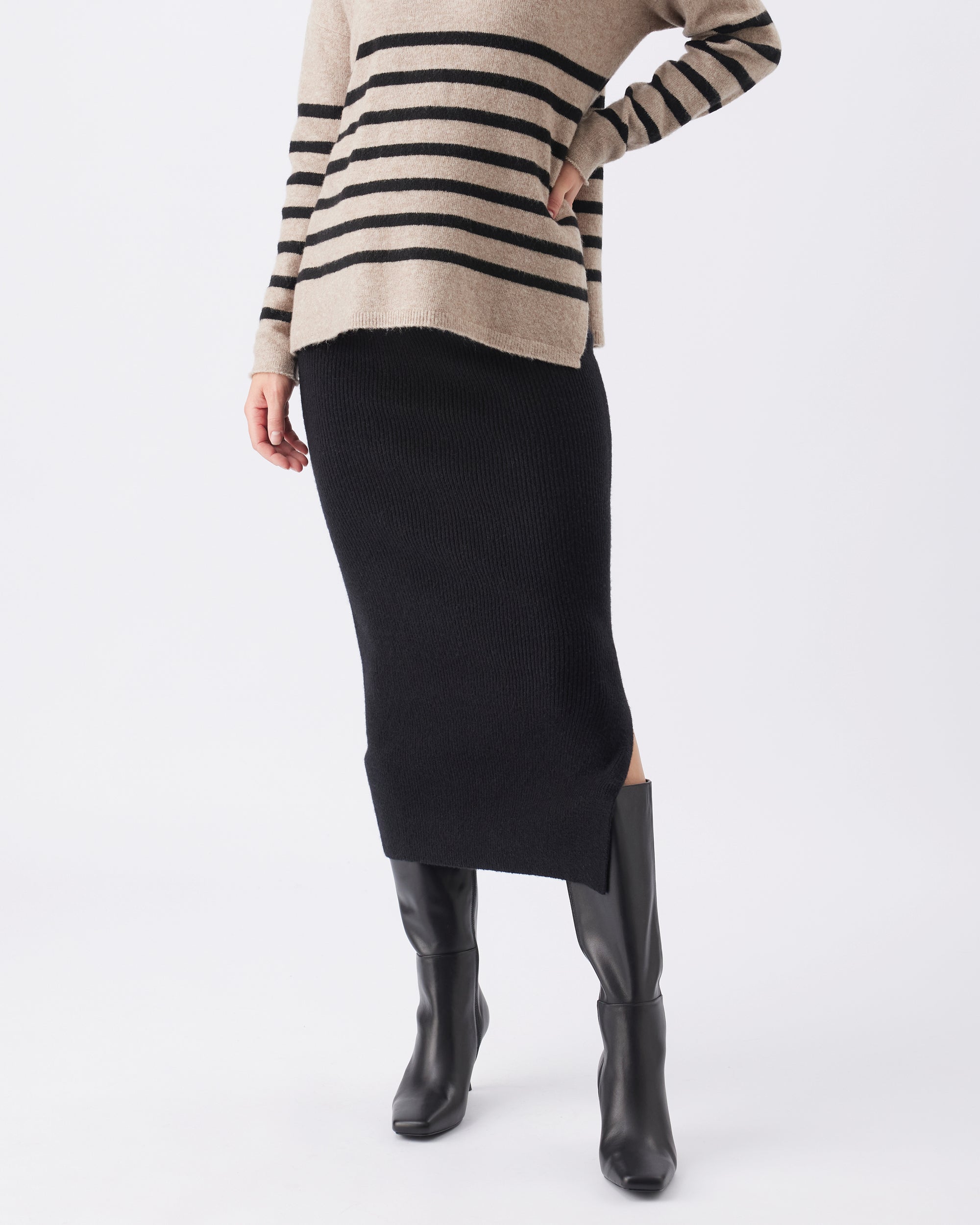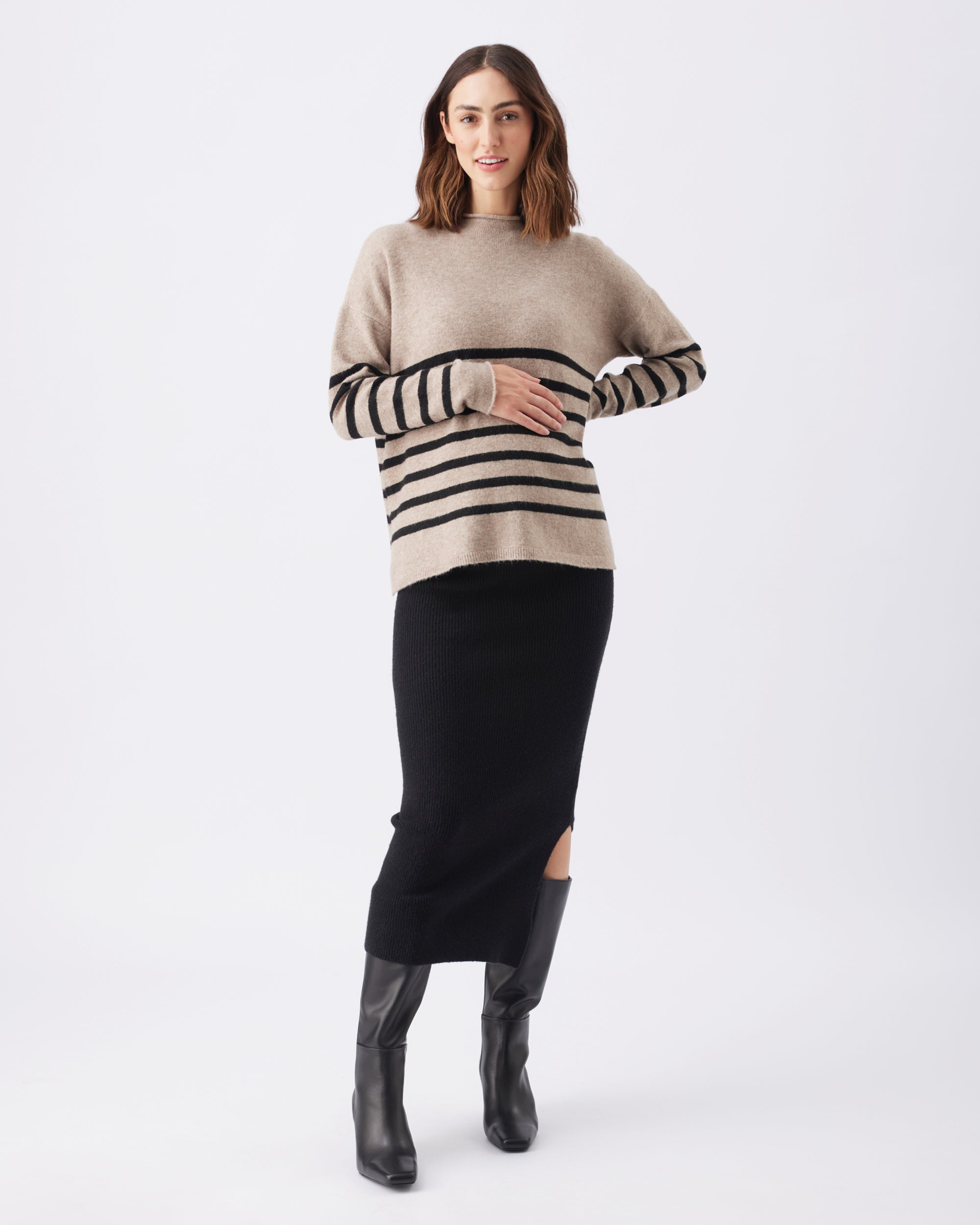 Nothing says winter like a knit skirt. This body con knit skirt is designed to sit high over your bump and fit perfectly throughout all stages of pregnancy. Have some fun styling this soft ribbed knit skirt with a cropped top or tied up tee, or wear as a set with the Sandy Knit.