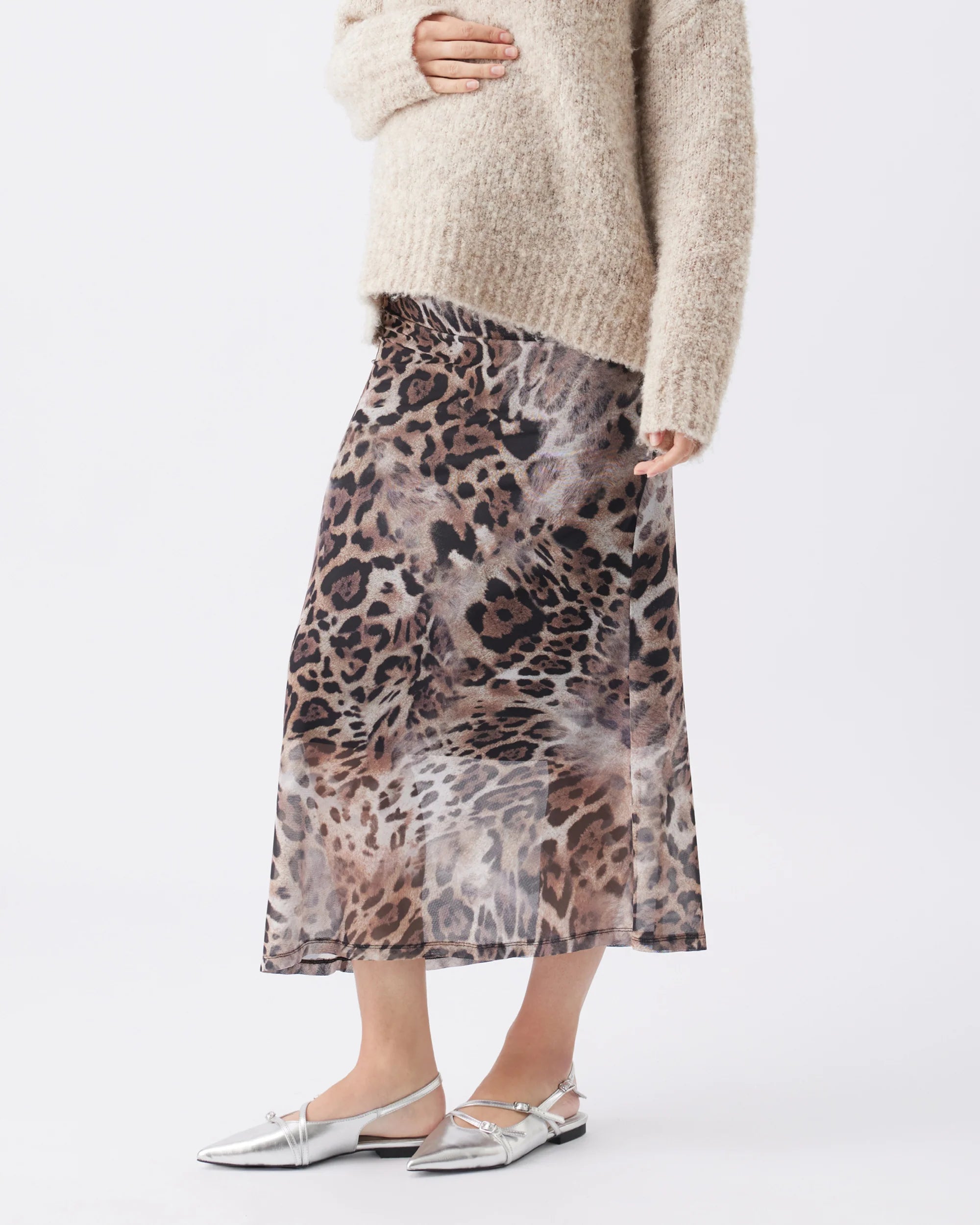 A maternity skirt offering a feminine feel with a modern touch! This skirt features a soft mesh outer layer, adorned with a trendy animal print. The thoughtful design is bias cut with a soft viscose jersey. An elastic waistband ensures a comfortable fit. Dress it up for the office or down with a white sneaker and knotted tee!