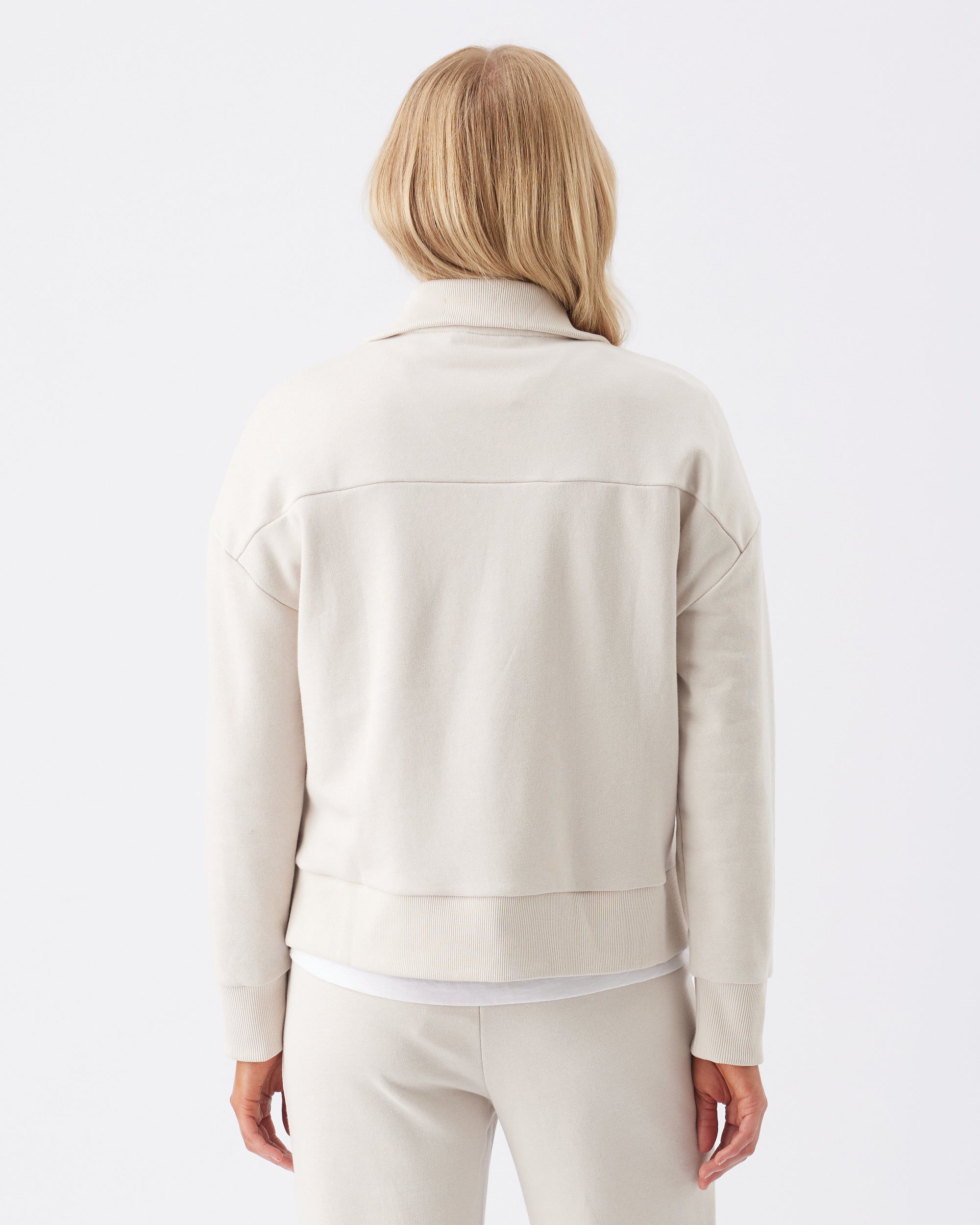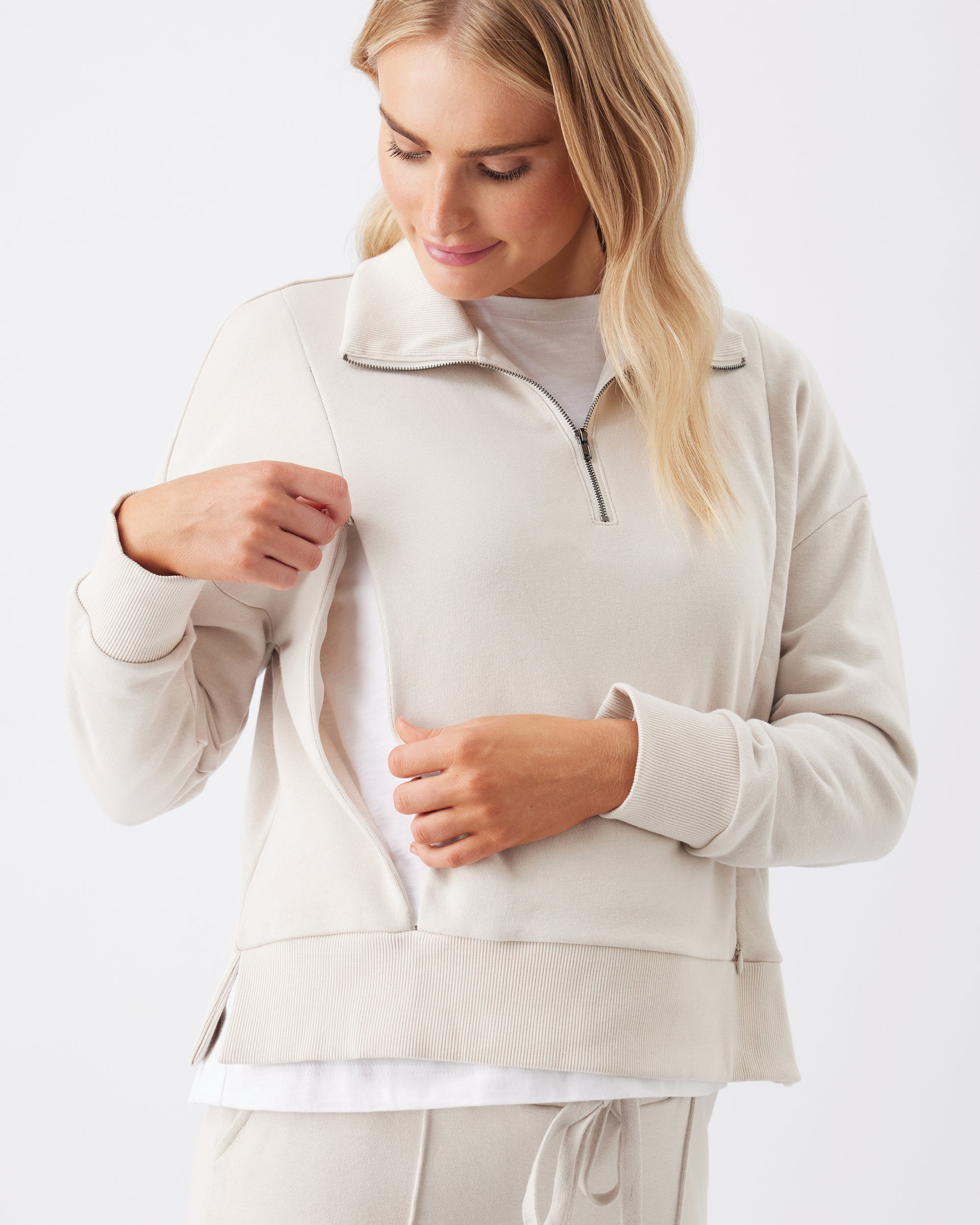 The trendiest maternity sweatshirt that easily goes from staying in to going out! With all the room you need to go about your day in comfort, thanks to its relaxed fit and side-seam slits on the waistband. It’s made from midweight terry back jersey that’s smooth on the outside with the perfect drape. This funnel-neck sweatshirt with half-zipper at the front also features ingenious invisible zippers for added functionality beyond pregnancy whilst nursing. Make it a set with the matching joggers.