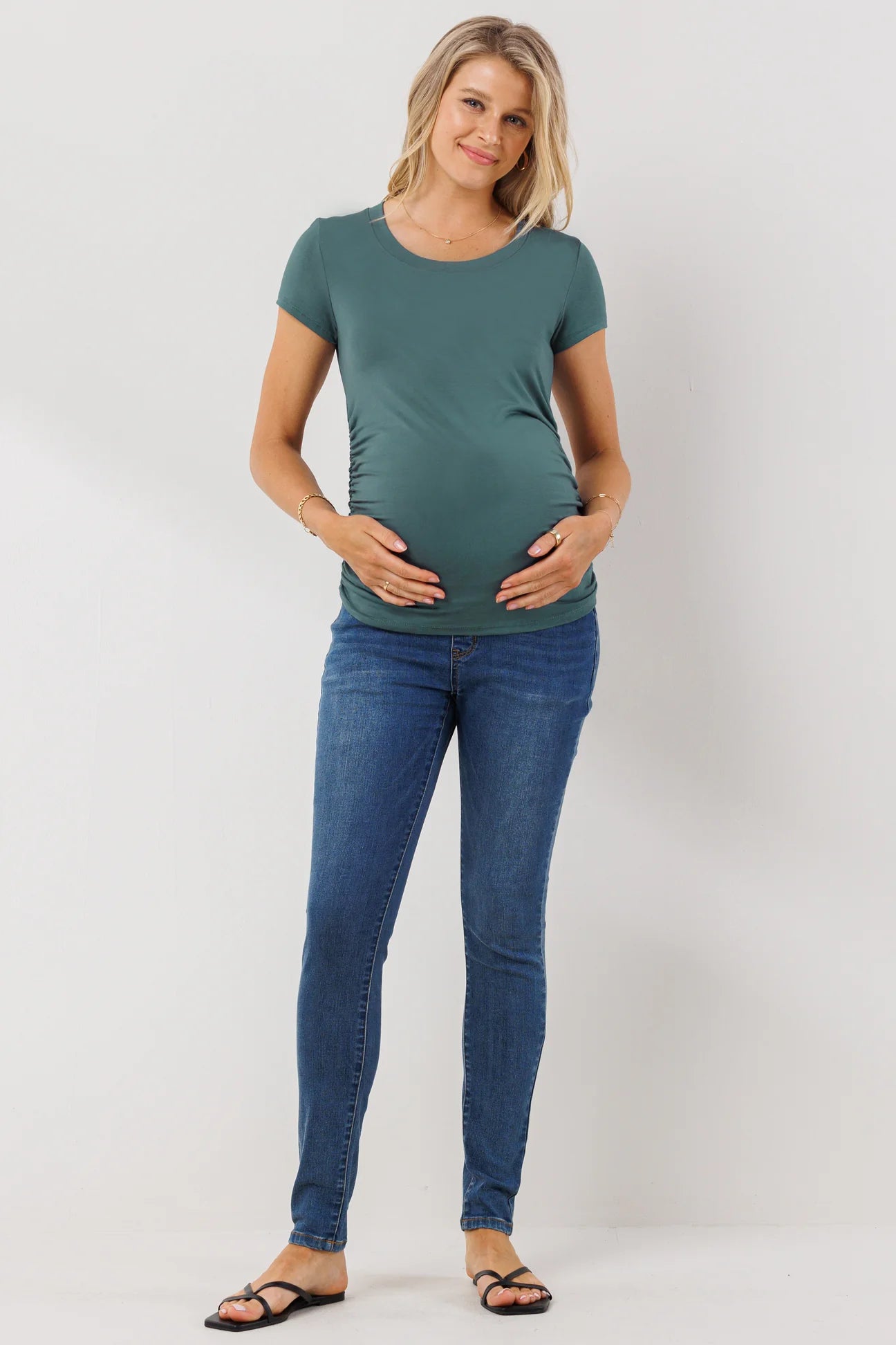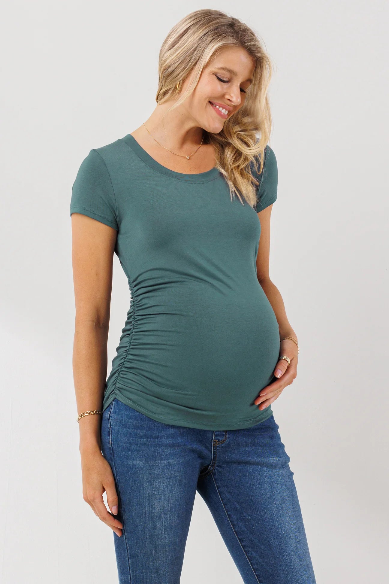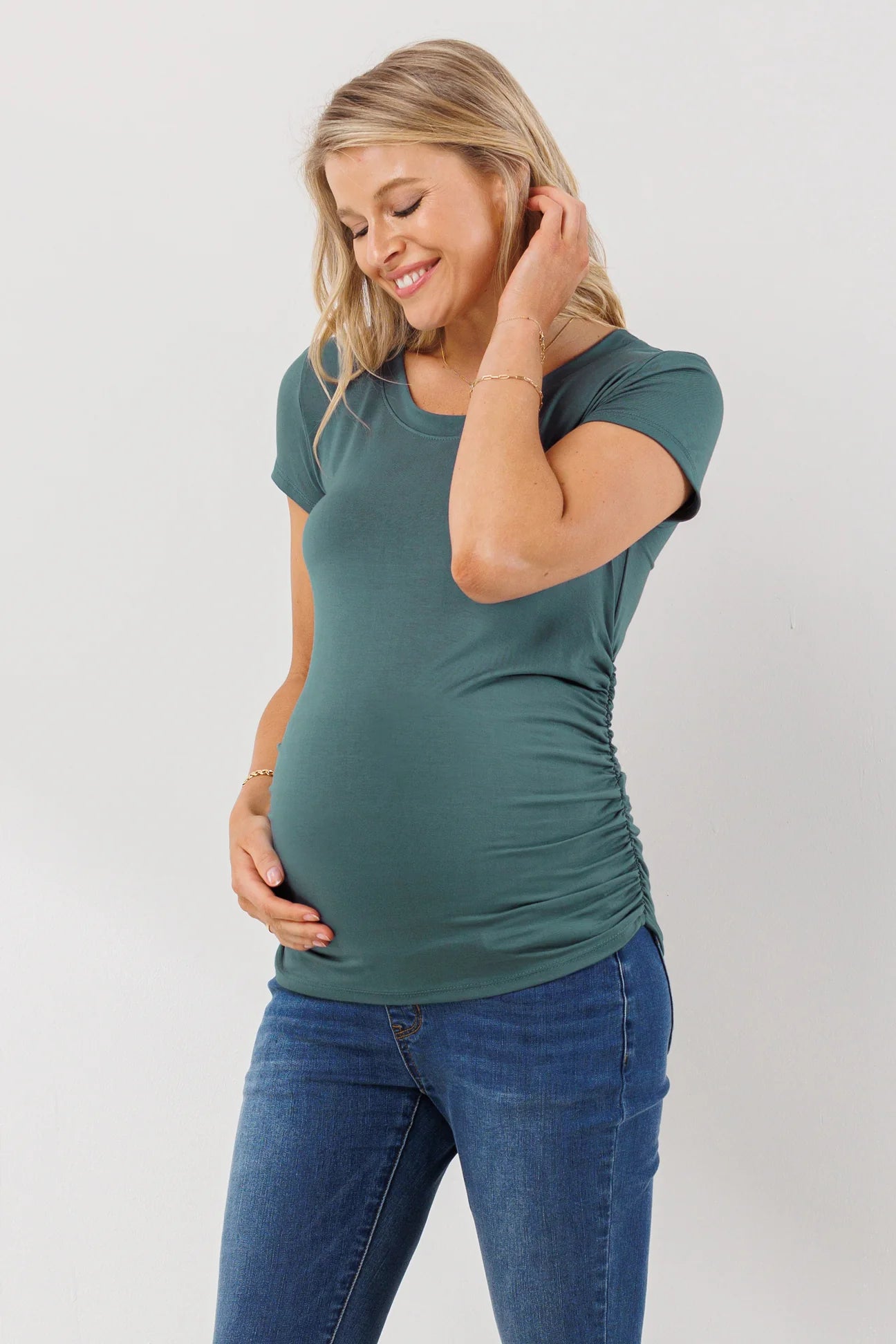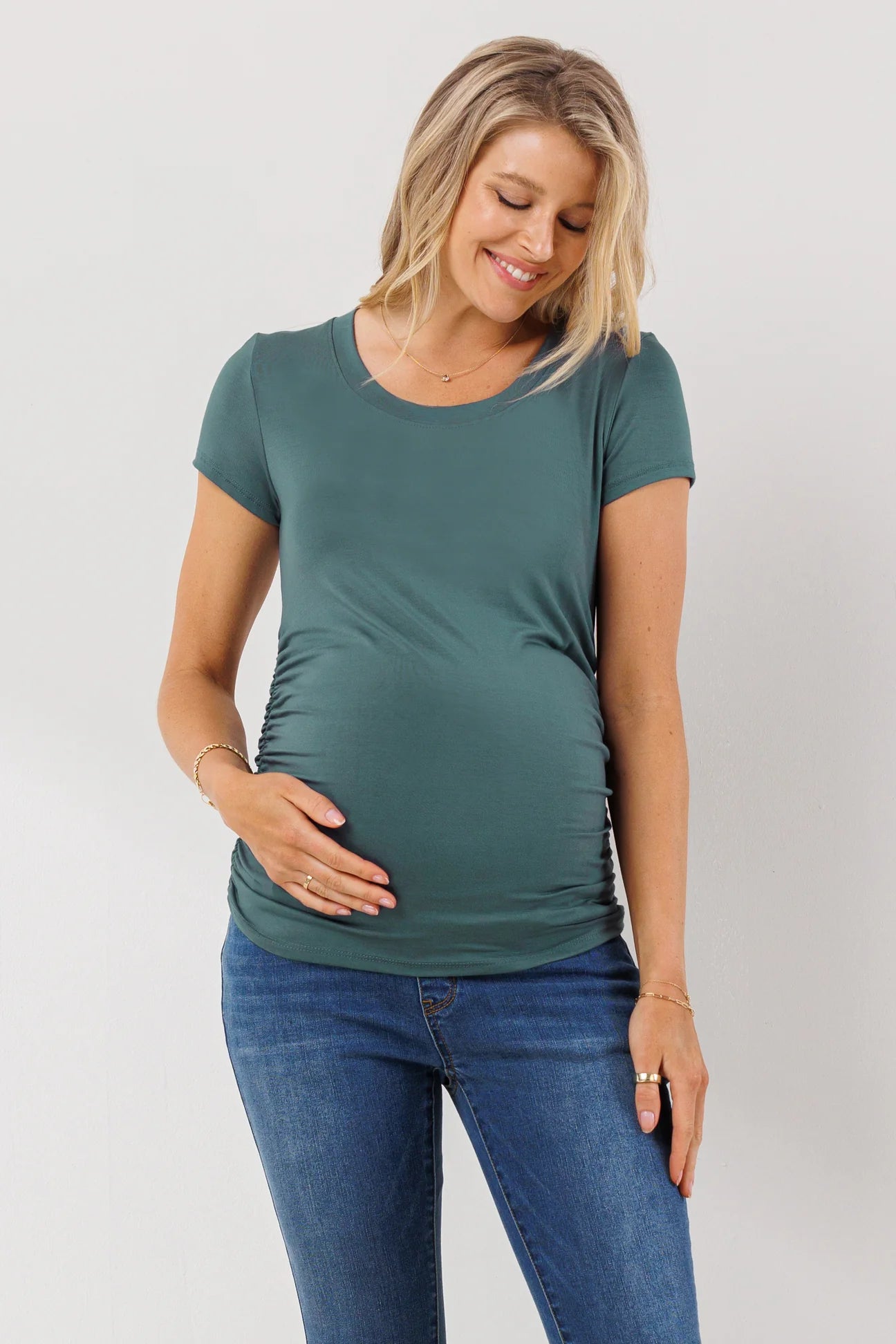 One essential piece for every new maternity wardrobe is a great tshirt. When you  start to notice your regular tops becoming a little tight and a little short, it's time to stock up on some basic tees that will go the distance with you. The side ruching will flatter your growing bump and allow this super-stretchy tee to fit perfectly in every stage.