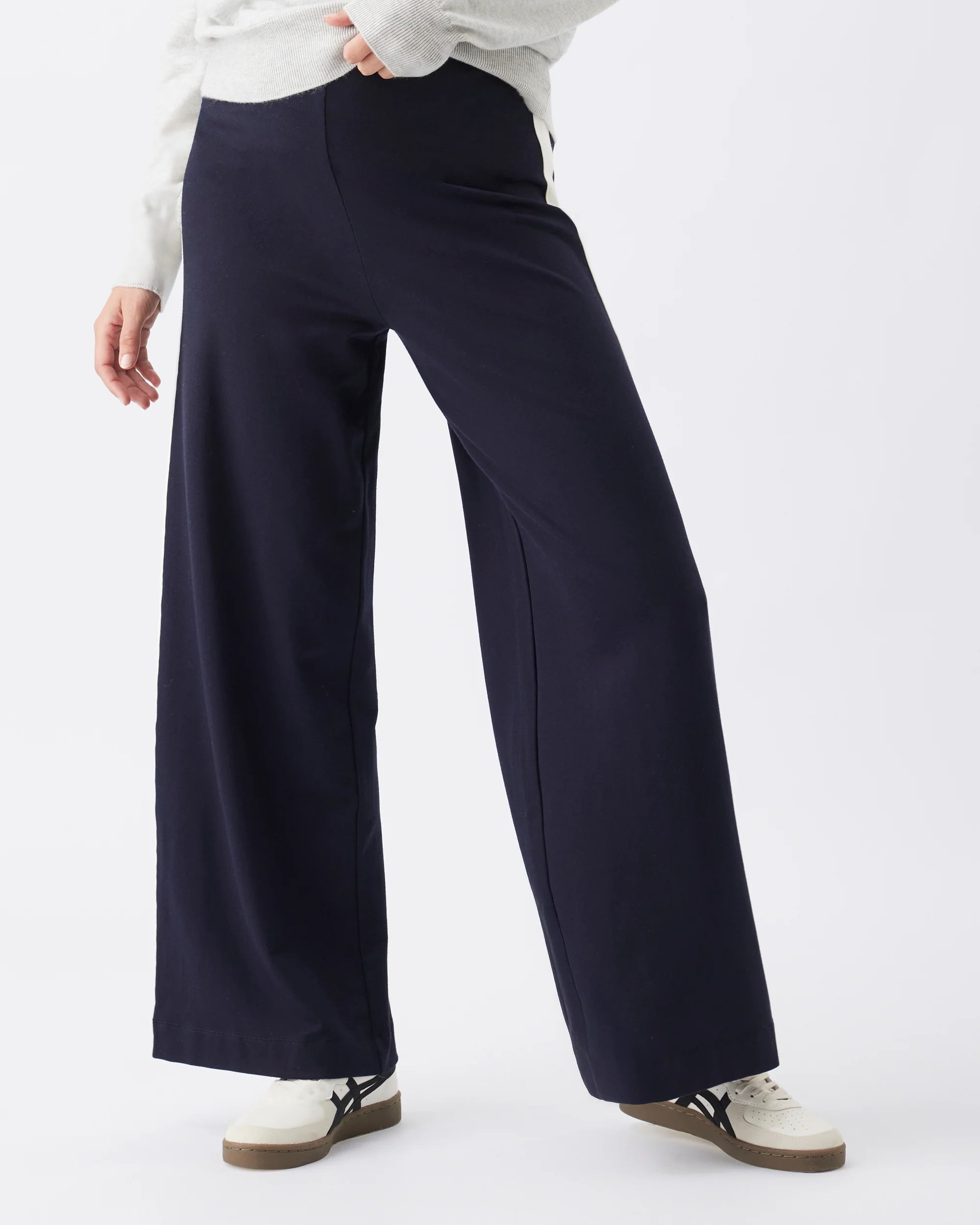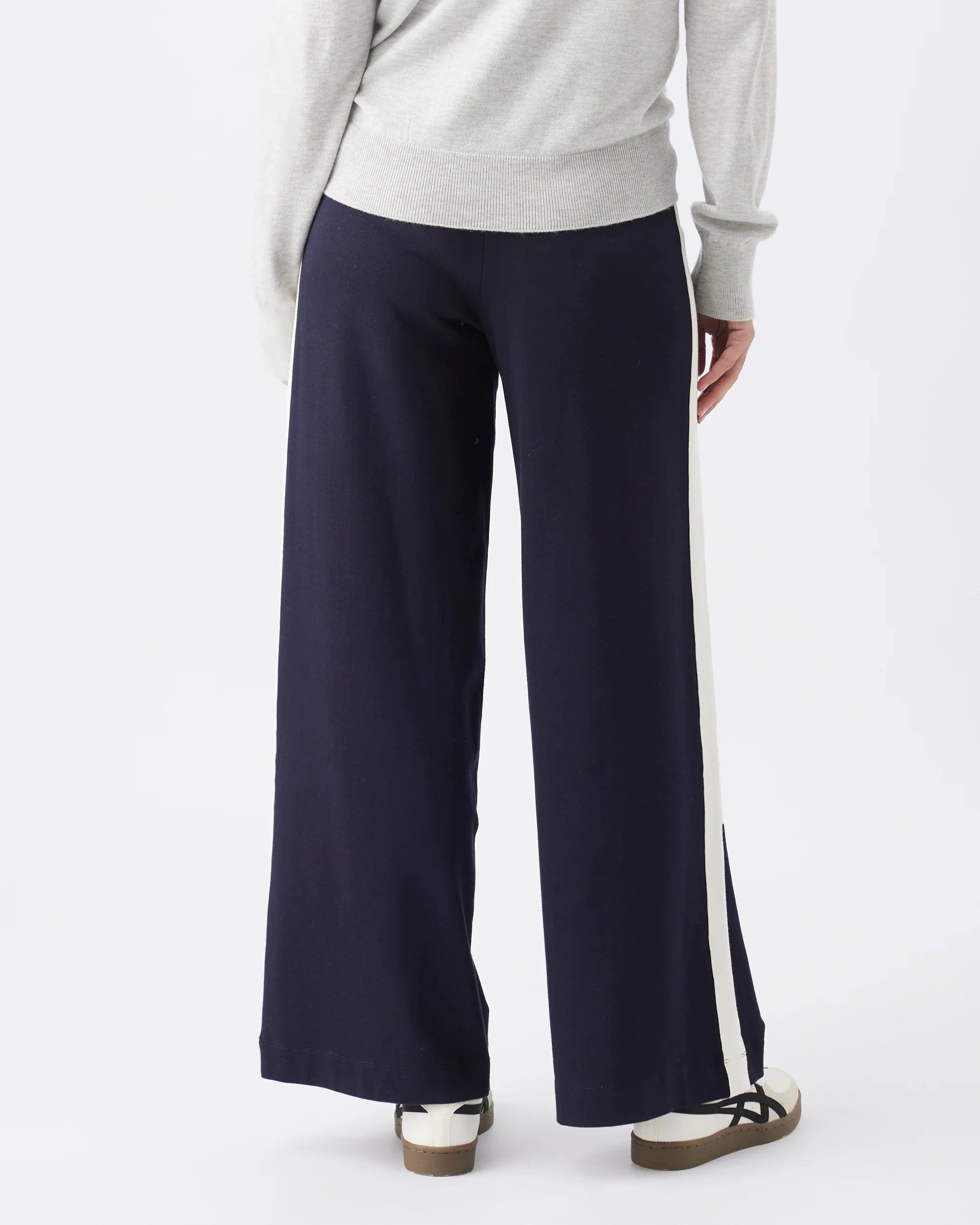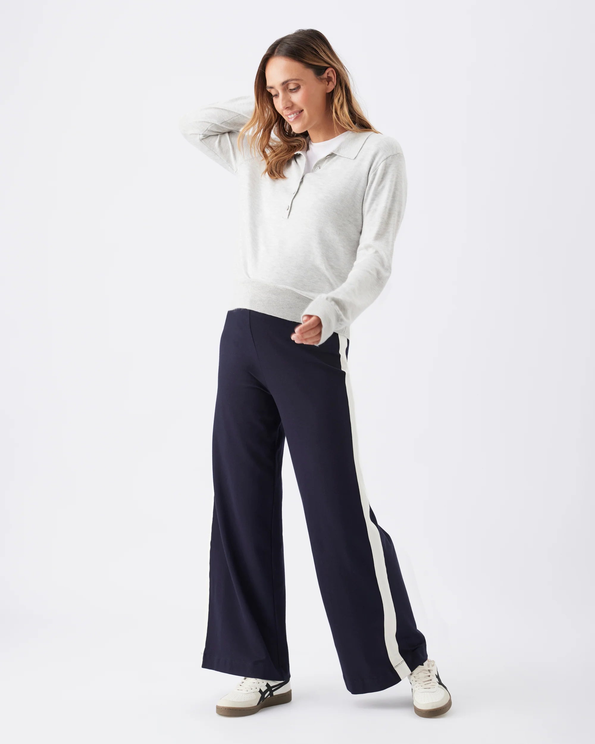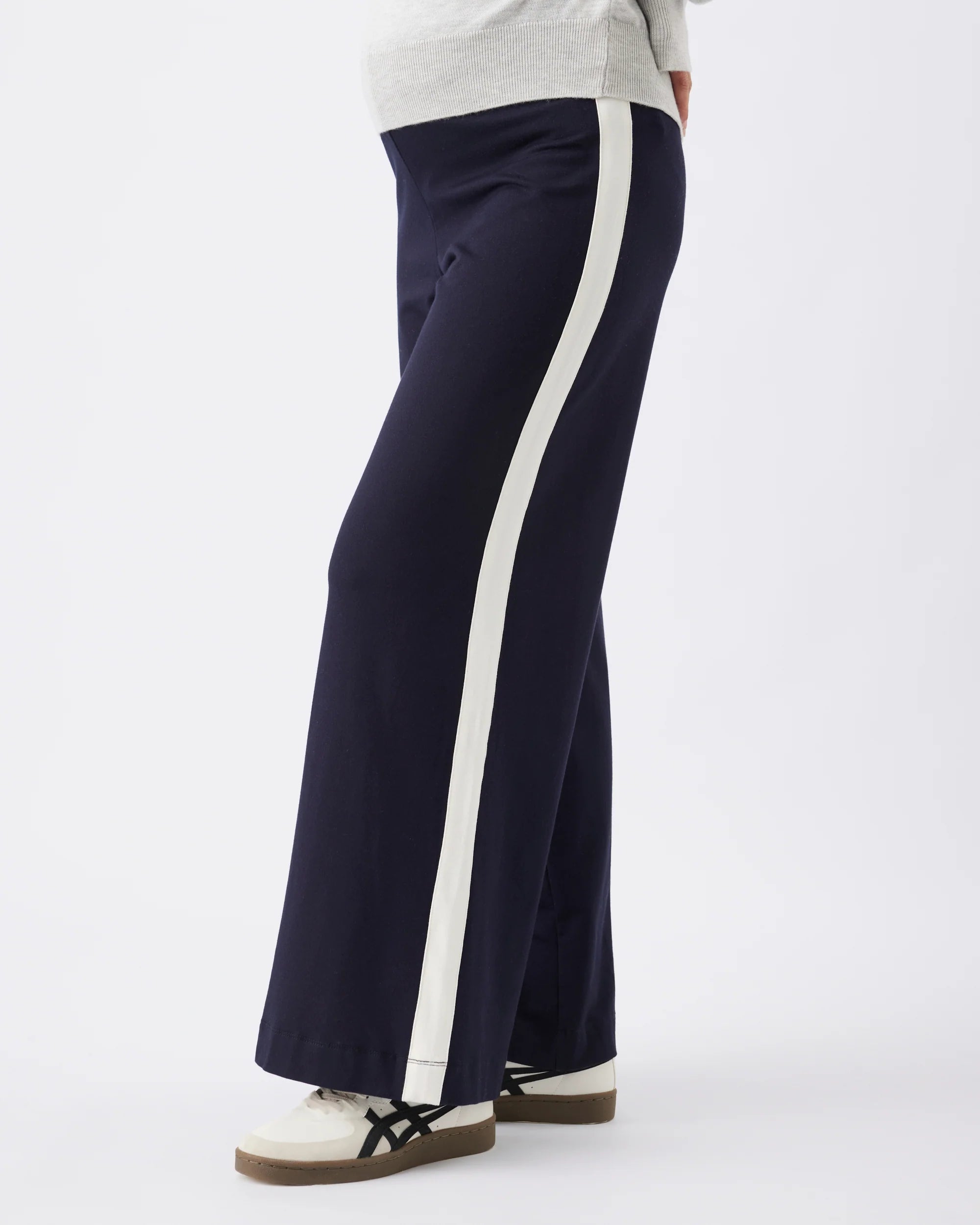 Your maternity sporty wear just levelled up! These track pants are elevated comfort & oh-so stylish! Featuring a soft twill jersey fabric that drapes beautifully over your bump. The wide-leg silhouette and contrast side stripe add a modern, elongating touch.