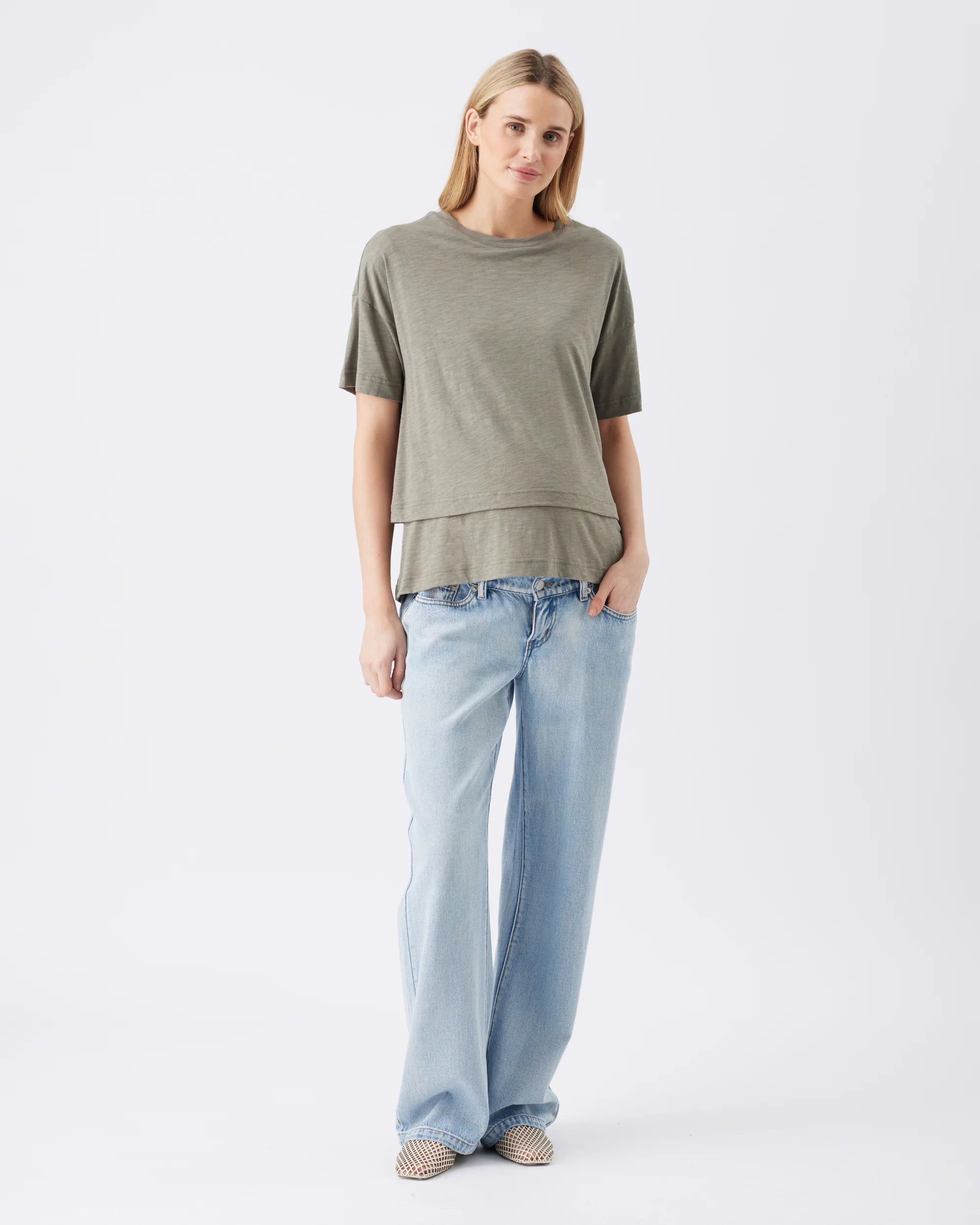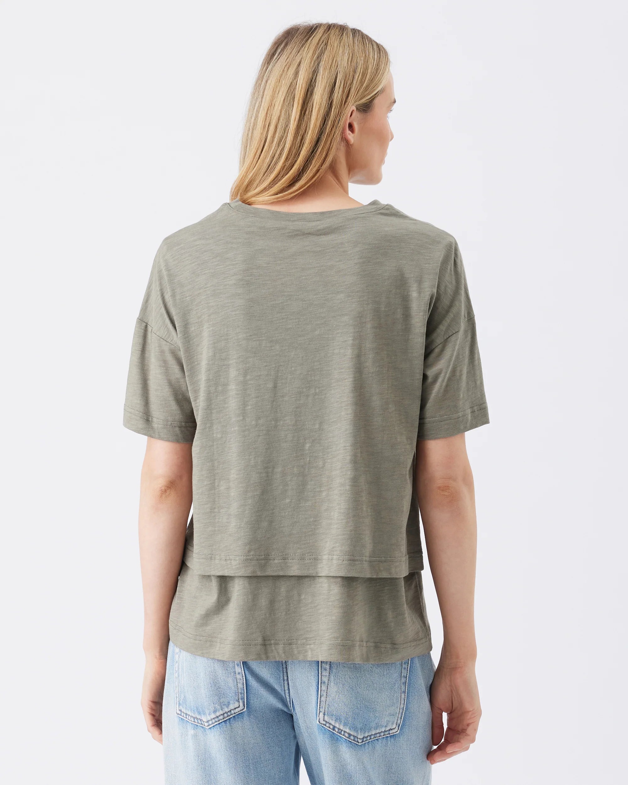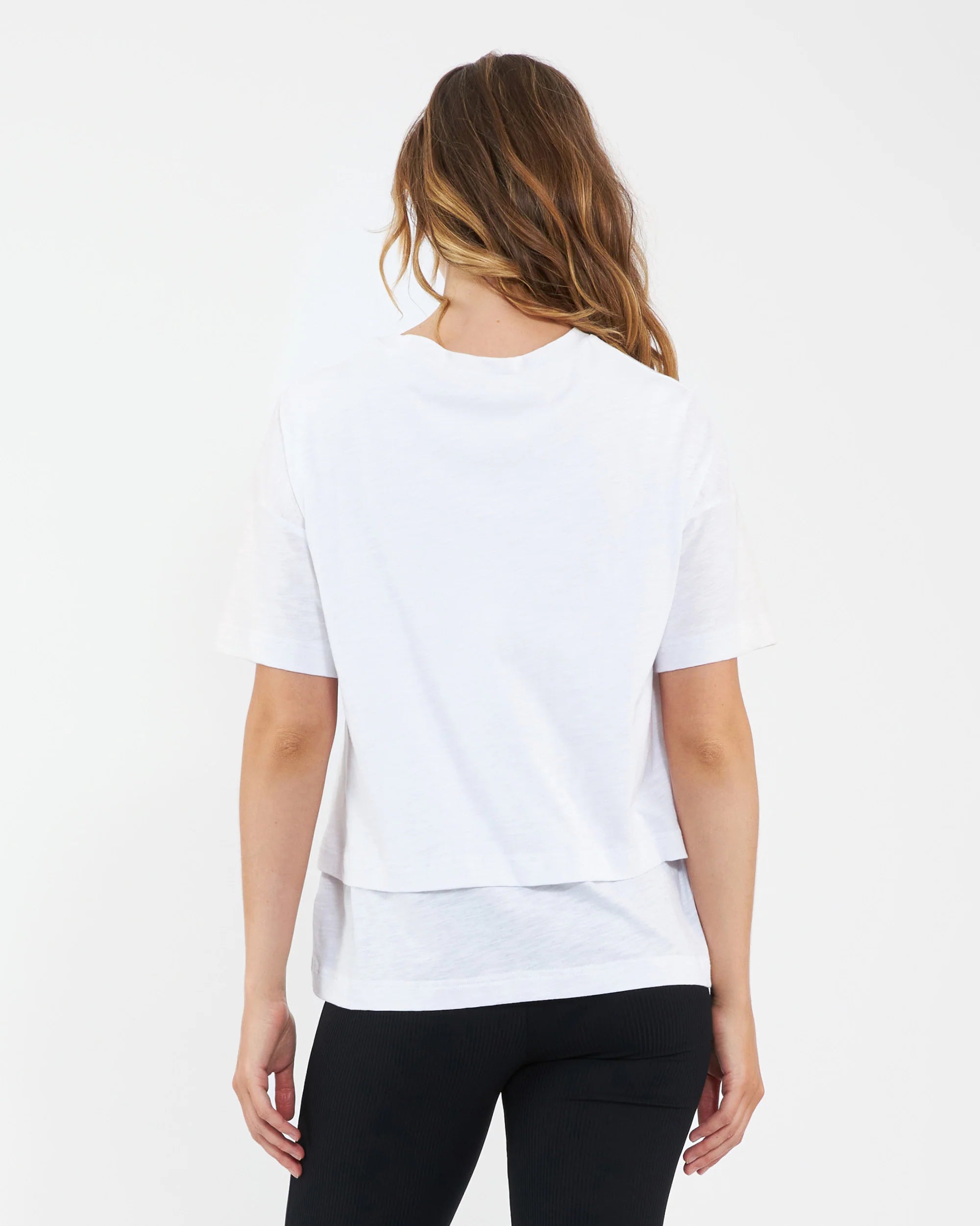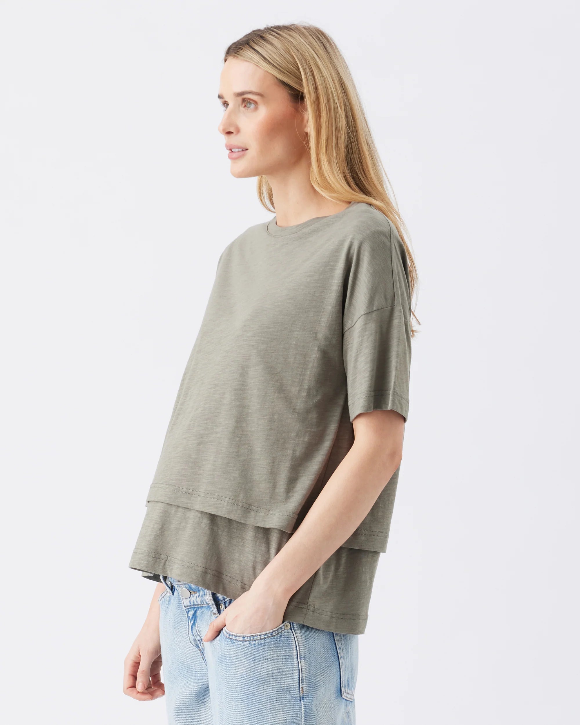 Say hello to your new favourite tee. Crafted from a blend of cotton and modal for a stretchy, cozy feel on your skin, this top is a sleek and comfortable option for easy casual outfitting in any season. With a classic short sleeve design, crew neckline, and relaxed fit, Claud can also be worn as a crop-length top by tucking the bottom layer - making it the perfect basic to style with all skirts, jeans and suiting options from work to weekend. Its lifted front ensures easy nursing access, making this top you'll reach for time and time again.