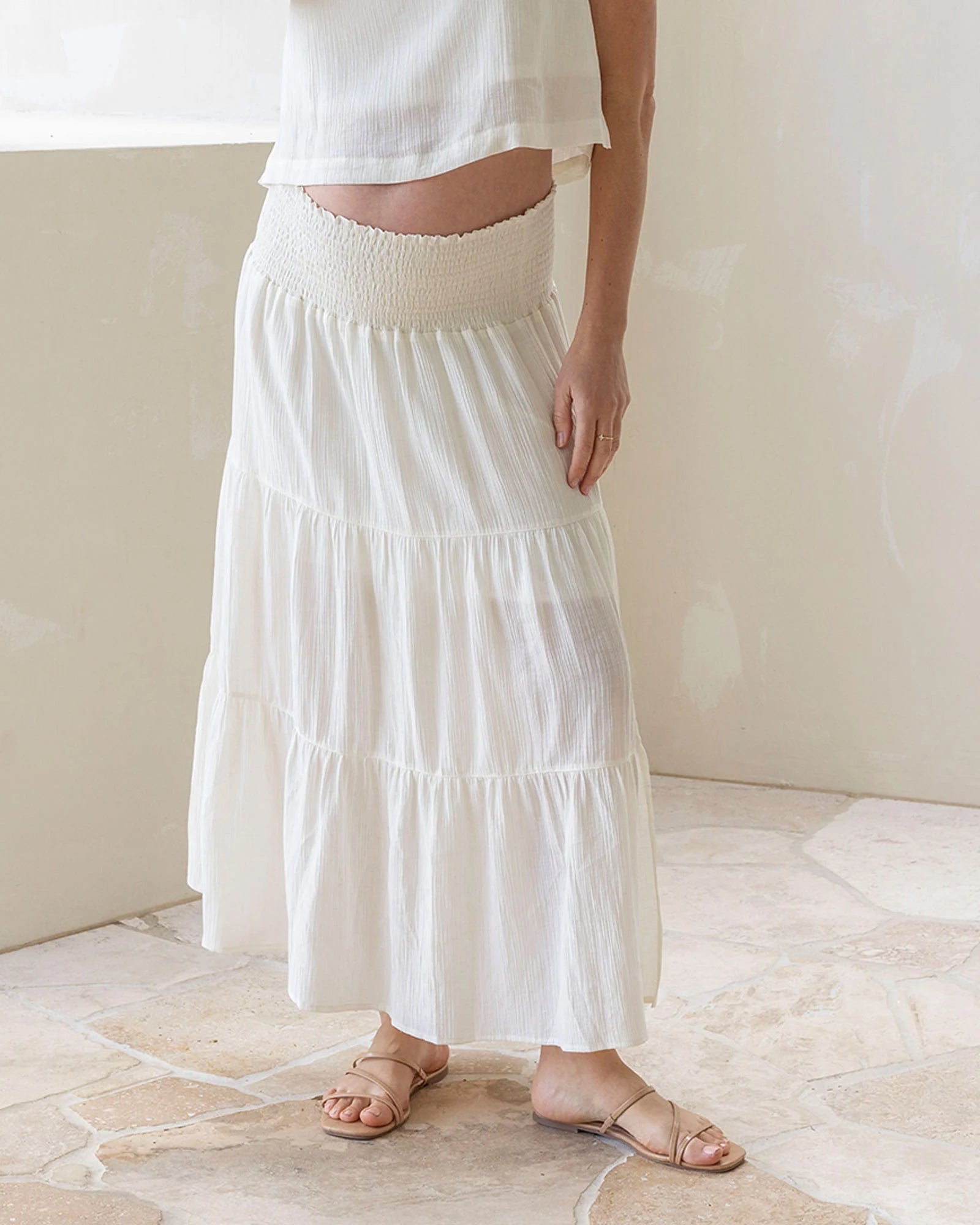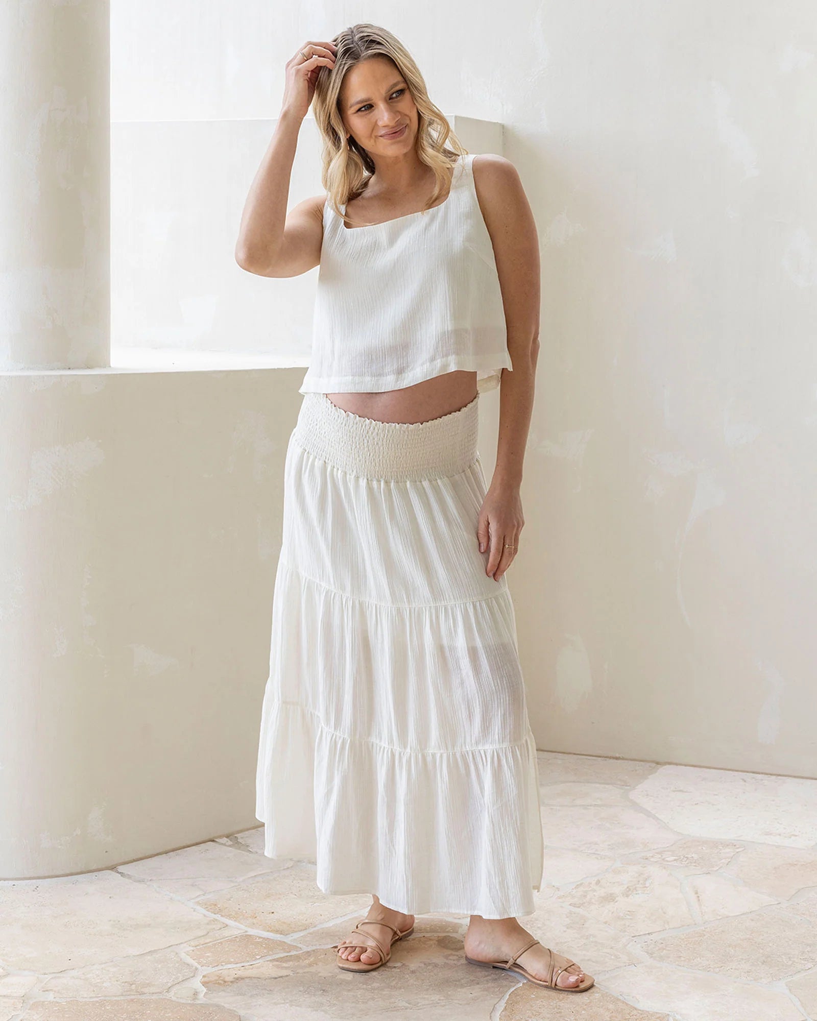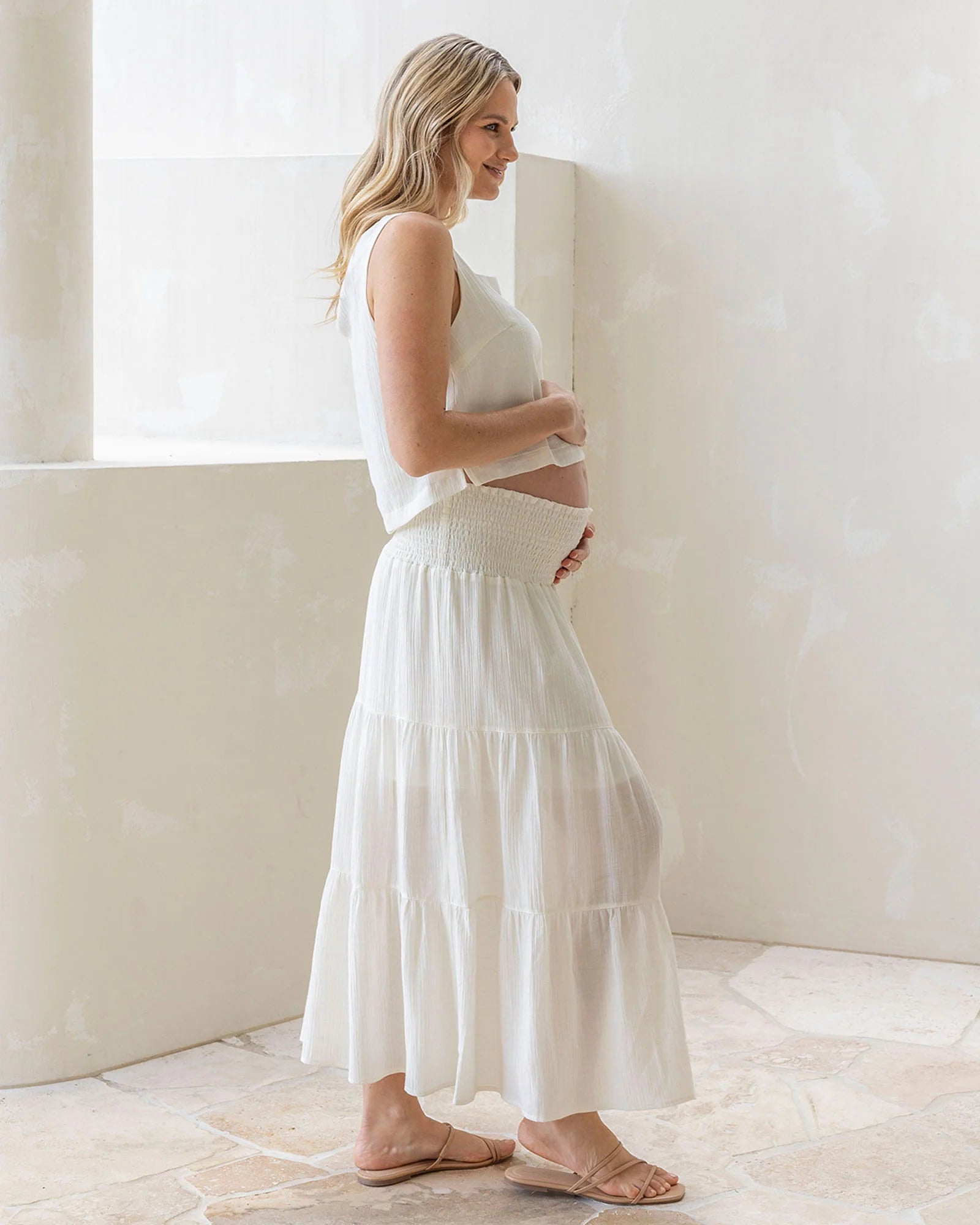 Designed with a soft, stretch shirred waistband, this skirt adapts beautifully to your growing bump and is equally flattering post-pregnancy. Its tiered maxi design creates a flowy, feminine silhouette. Pair it with a matching colour top for a chic look.