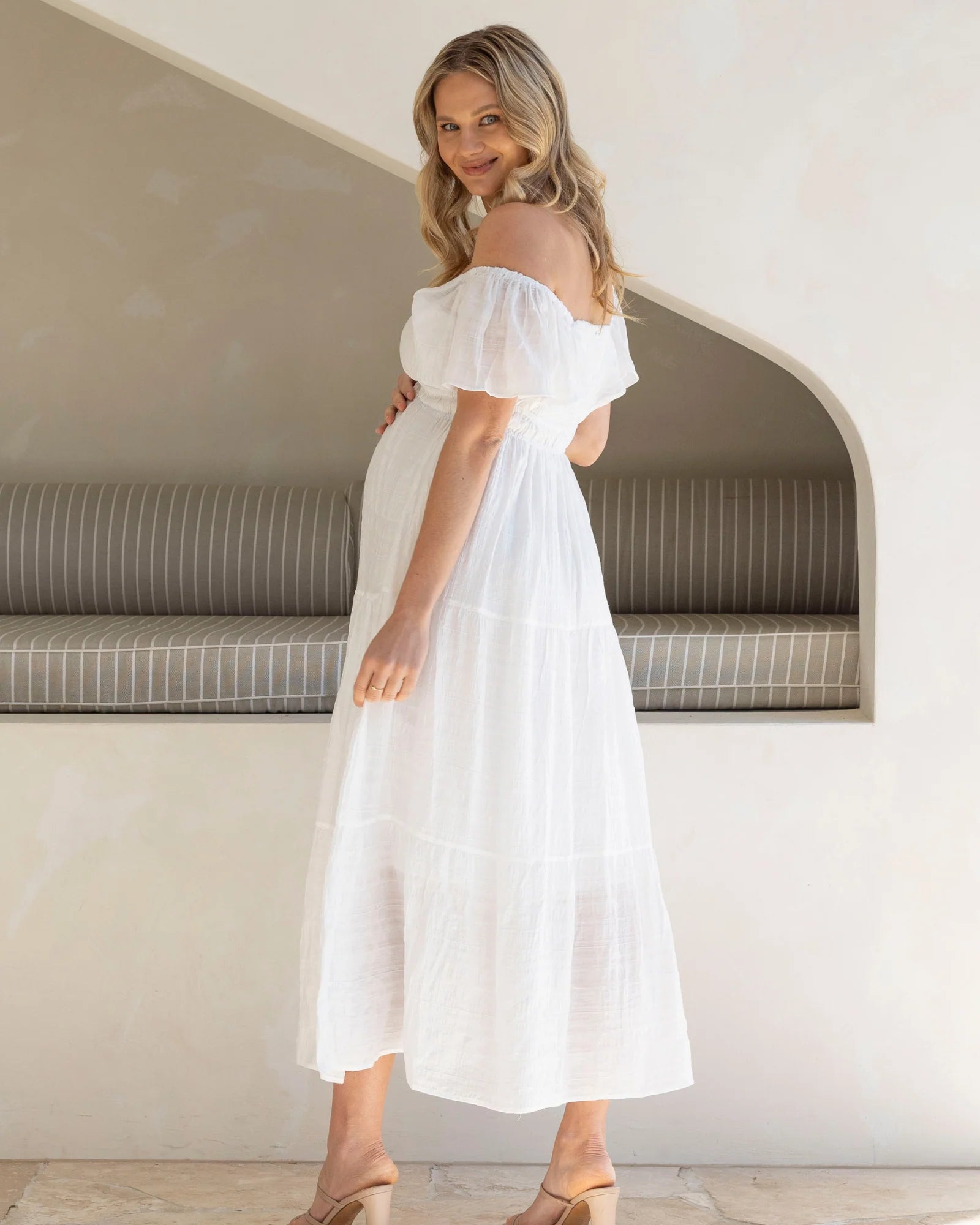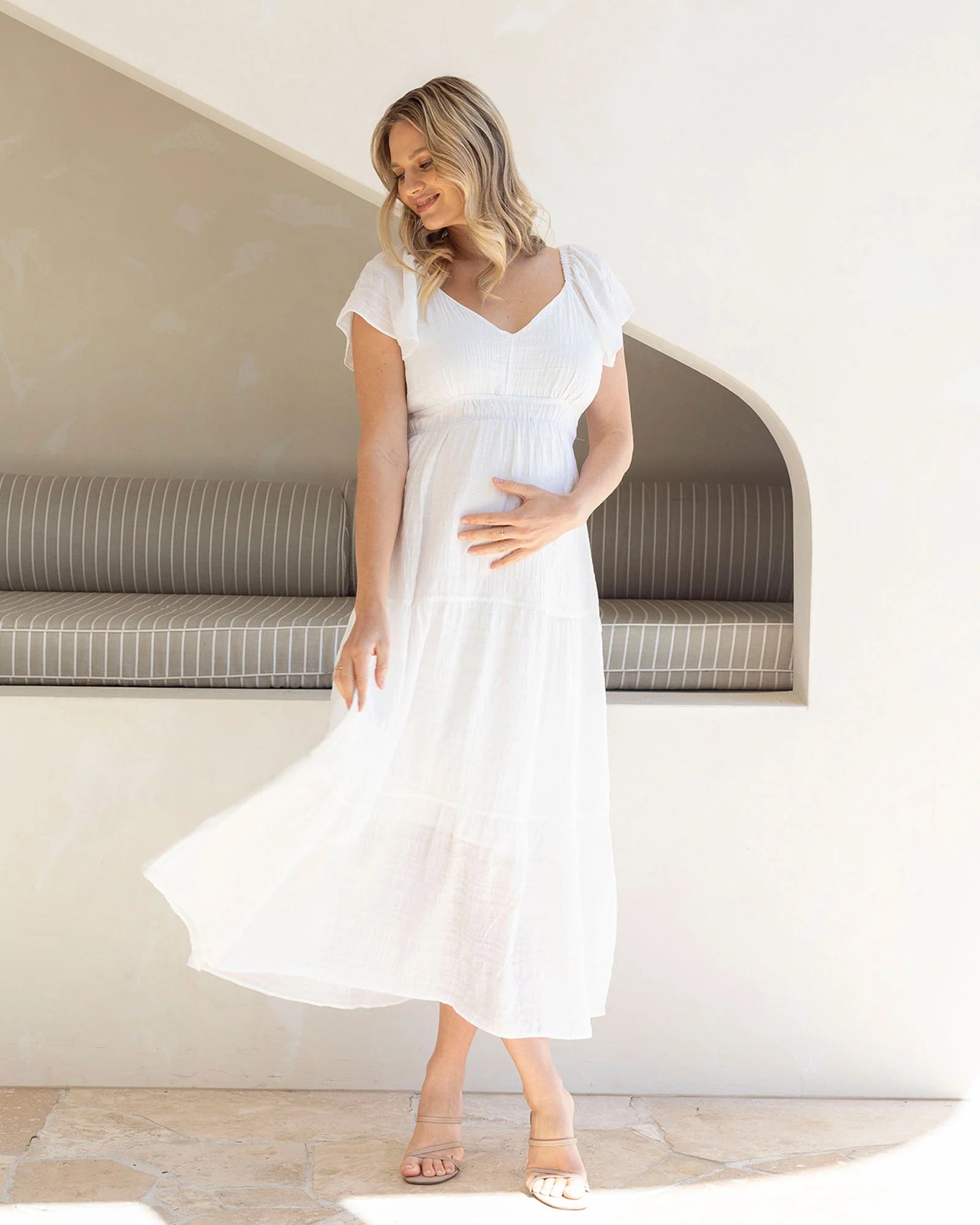 An simple & elegant maternity sundress that is perfectly designed for a baby shower or any summer occasion. Designed with comfort and style in mind, the Lila dress features a flattering empire waist and a flowy, tiered skirt that beautifully highlights your growing belly while allowing for effortless movement. The soft, textured fabric provides a light and airy feel, making it an ideal choice for a relaxed outdoor celebration or casual gathering.